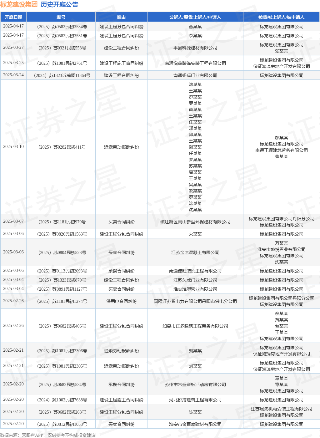 本站消息,根据天眼查APP显示,近日公布了一则标龙建设集团有限公司作为被告/被上诉人的开庭公告,详细内容如下: